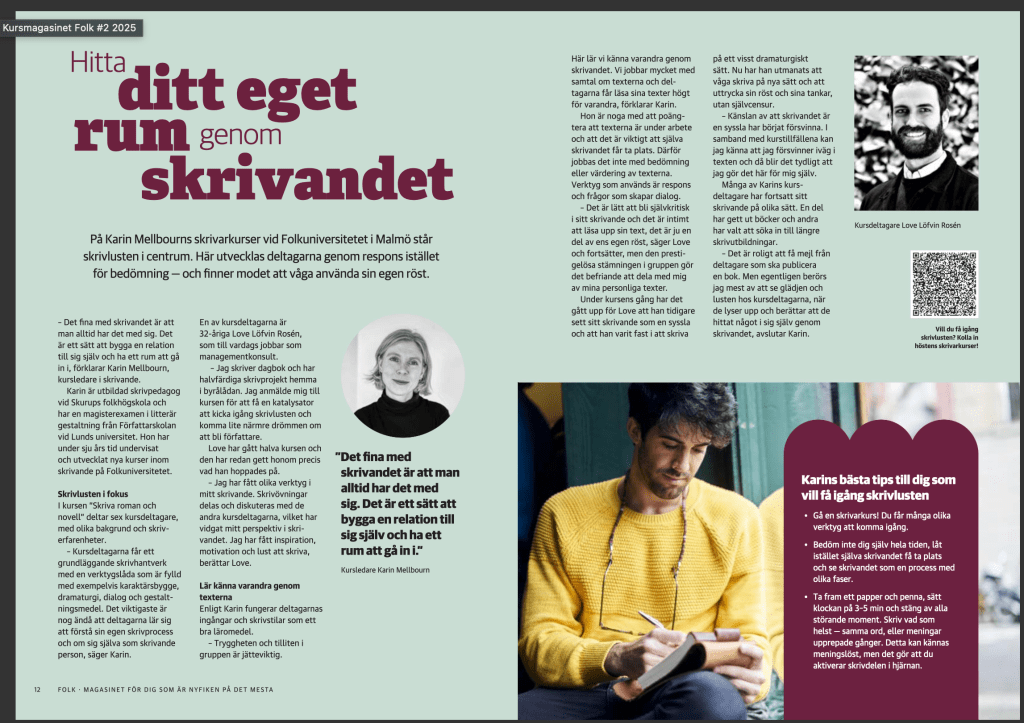 I reportaget från kursmagasinet Folk kan du läsa om hur det kan vara att gå en skrivarkurs med mig!